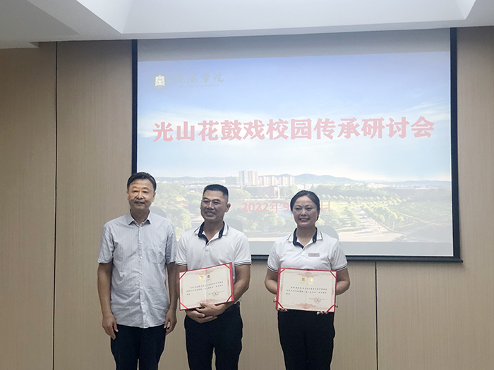 王志华代表学校向光山花鼓戏非遗传承人张秀芳、方应亮颁发了河南省首批中华优秀传统文化传承基地(光山花鼓戏)传习指导专家聘书。