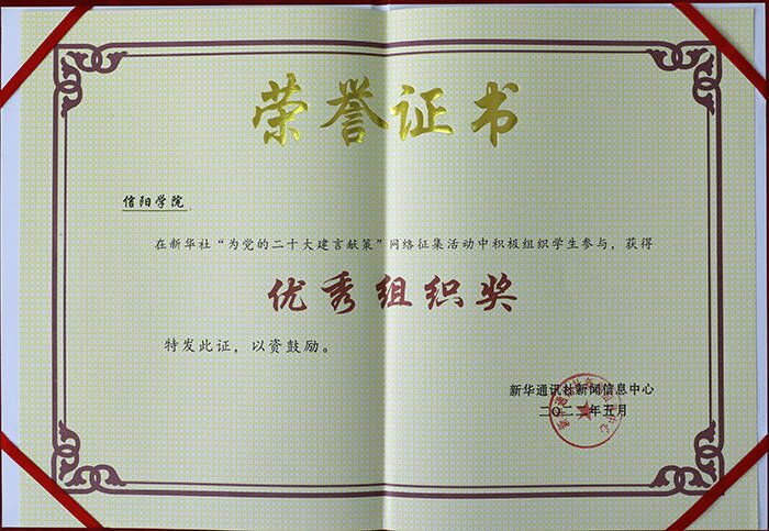 近日,新华社公布“为党的二十大建言献策”网络征集活动获奖高校和师生名单。我校积极组织学生参与,踊跃建言献策,受到重视和好评,荣获“优秀组织奖”。