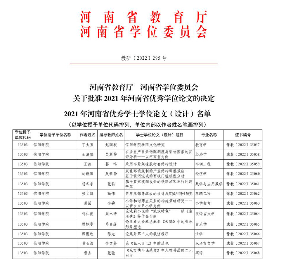 近日,河南省学位委员会、河南省教育厅发布《关于批准2021年河南省优秀学位论文的决定》(教研〔2022〕295号),我校12篇学士学位论文获评为2021年河南省优秀学位论文,获优比例位居同类高校前列。