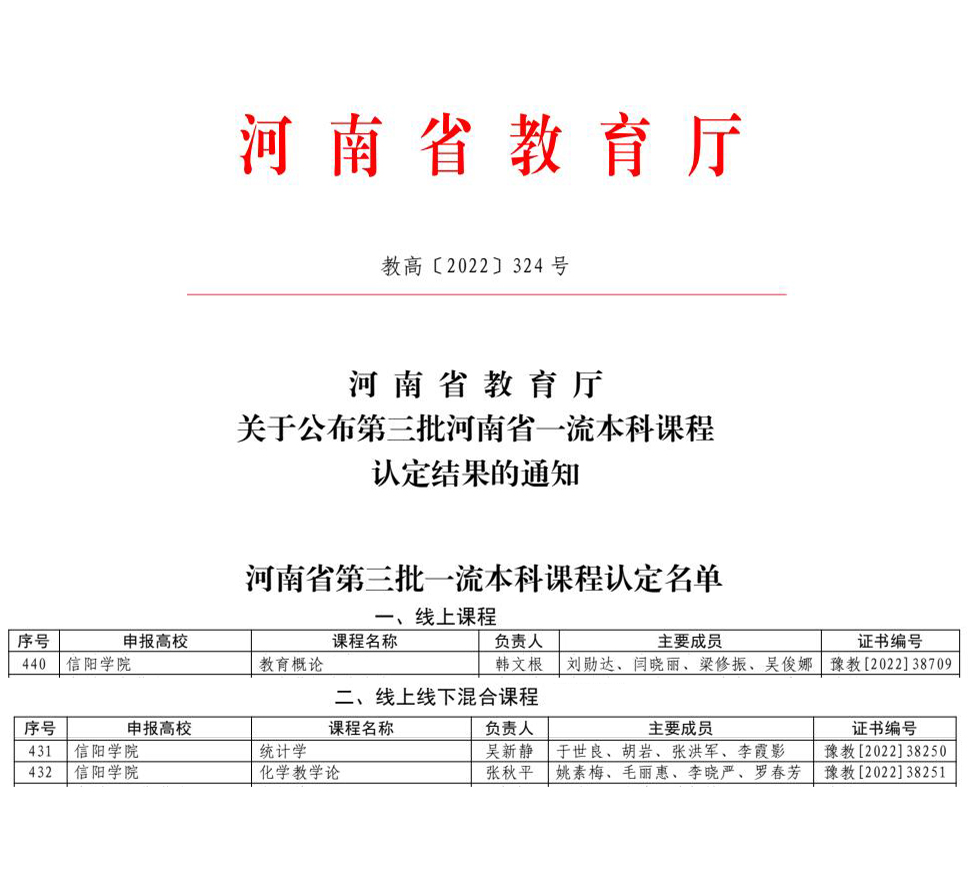 近日,河南省教育厅下发《关于公布第三批河南省一流本科课程认定结果的通知》(教高〔2022〕324号),我校3门课程被认定为第三批河南省一流本科课程。其中,教育学院韩文根教授申报的《教育概论》课程被认定为省级线上一流本科课程,商学院吴新静副教授申报的《统计学》、理工学院张秋平副教授申报的《化学教学论》等2门课程被认定为省级线上线下混合式一流本科课程。截止目前,学校已有9门课程获批河南省一流本科课程。