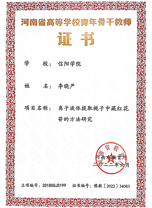 近日,河南省教育厅发布了《关于公布2018年度河南省本科高等学校青年骨干教师培养对象考核结果的通知》(教高[2022]213号),我校2018年度河南省青年骨干教师培养对象李晓严顺利通过考核,被正式认定为“河南省高等学校青年骨干教师”。