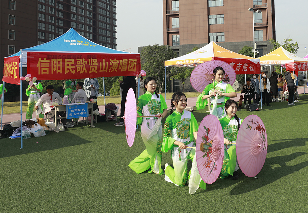 在由马克思主义学院朱新荣博士等担任指导老师的大别山精神研究社,同学们积极探讨发挥革命传统、传承红色基因等问题,引发了许多同学参入其中;在信阳民歌贤山演唱团展位前,协会同学身着独具特色的传统服饰,伴随着悠扬婉转的音乐,踏着轻快优美的舞步,时而浅吟低唱,时而高亢嘹亮,为在场师生们表演了一段精彩的茶乡歌舞,赢得了大家的纷纷喝彩和赞扬。其他各社团也纷纷拿出各自的“看家绝活”,各出奇招,书法、绘画、写作、诗歌、朗诵、演讲、球艺、拳技、环保、军事、商务、建筑、计算、建模、裁判、歌舞、乐器、魔术、职业规划、志愿服务、智能制造等独具特色的才技表演,精致美艳的各种服装、饰品、道具,实验模型、实验设备吸引了不少新生纷纷加入体验,在校园里形成了一道靓丽的风景线,展现了我校学生社团昂扬向上的精神风貌和丰富多彩的文化活动。