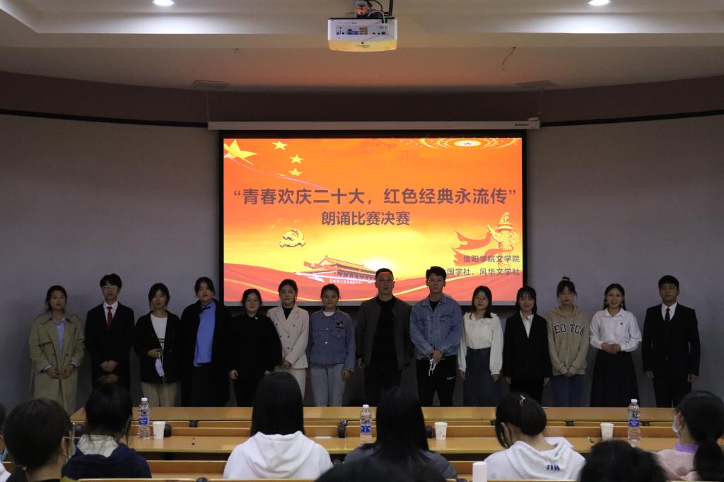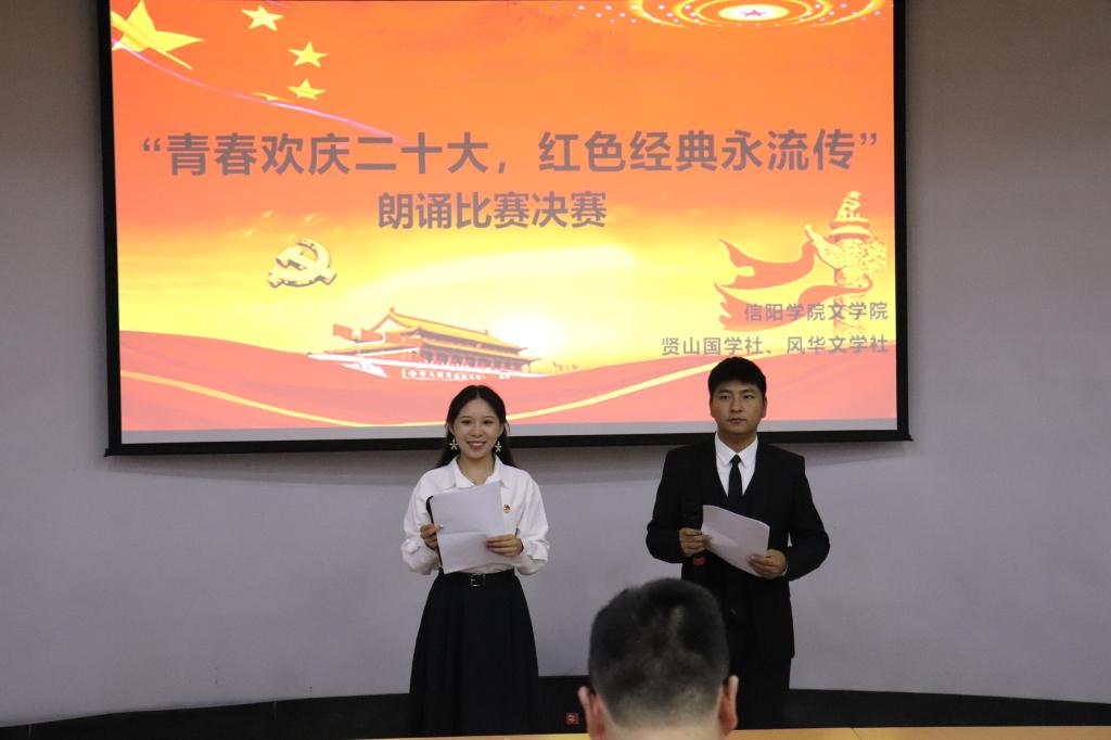 为深入开展爱党爱国教育活动,弘扬社会主义核心价值观主旋律,10月28日晚,由信阳学院文学院主办,贤山国学社和风华文学社联合承办的以“青春欢庆二十大,红色经典永流传”为主题的朗诵比赛决赛在理工楼116教室举行。文学院社团工作分管老师余毓斌,心理辅导站站长王悦和贤山国学社指导老师于彦磊出席本次比赛并担任评委。本次比赛由郝灵辉和秦雅静主持。