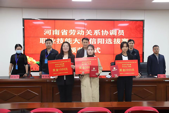 经过激烈角逐,我校2019级法学专业学生侯争艳荣获学生组一等奖,2020届法学专业毕业生马瑞荣获职工组二等奖,并分别获得奖金3000元、2000元。侯争艳、马瑞将和本次比赛另两名选手将代表信阳市参加2022年河南省劳动关系协调员职业技能决赛。此外,我校2020级、2019级法学专业学生陈威龙、冯晓雪分获学生组第8名、第9名的佳绩。