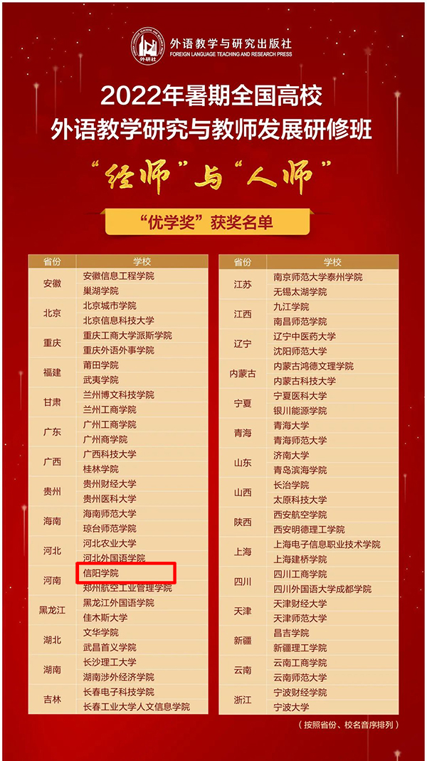 近日,外研社对参与2022年暑期全国高校外语教学研究与教师发展研修班的广大教师和积极组织开展研修、交流的各地院校进行表彰,我校喜获2022年外研社暑期线上研修班“优学奖”。