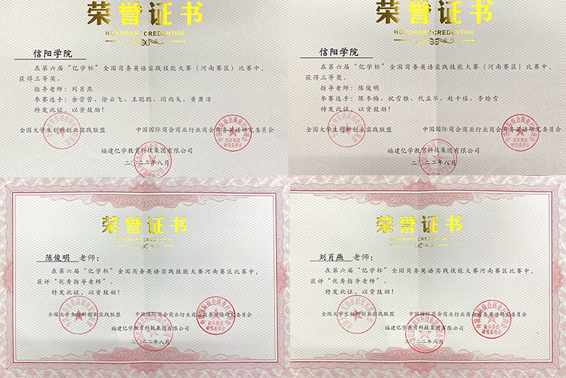 近日,2022年“亿学杯”全国商务英语实践技能大赛总决赛成绩揭晓,由信阳学院外国语学院学生陈冬梅、余营营等10名选手组成的两个代表队喜获(河南赛区)三等奖,陈俊明老师和刘肖燕老师荣获“优秀指导老师”荣誉称号。