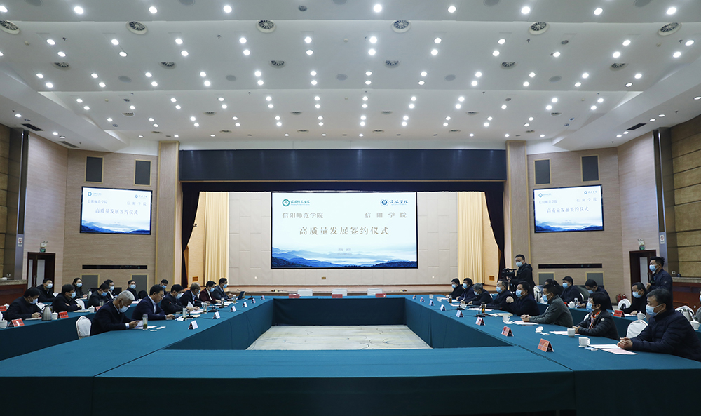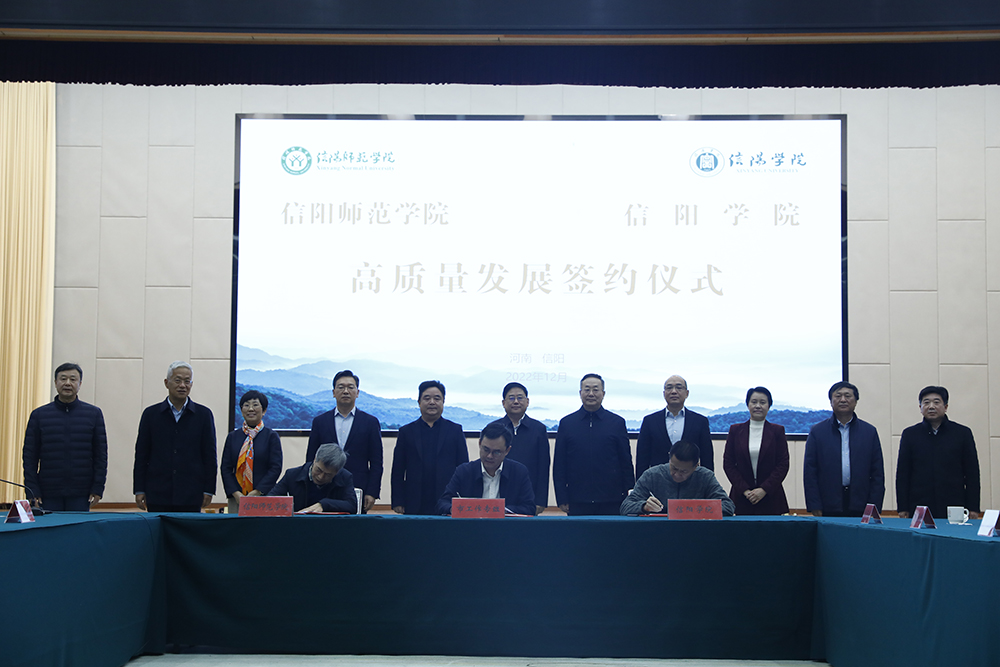 12月1日,信阳师范学院、信阳学院高质量发展签约仪式在市行政中心6号楼3楼会议室举行。市长陈志伟出席签约仪式并讲话。市委常委、常务副市长黄钫,市委常委、市委秘书长杨进出席签约仪式。我校董事长高峰、理事长高云、党委书记褚金海、副校长王志华,信阳师范学院党委书记王文鹏、校长李俊、副校长陈登报、江玉安出席签约仪式。市工作专班、信阳市相关单位负责人和两校相关部门负责同志参加签约仪式。签约仪式由杨进主持。