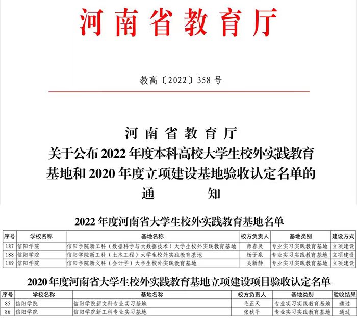近日,河南省教育厅下发了《关于公布2022年度本科高校大学生校外实践教育基地和2020年度立项建设基地验收认定名单的通知》(教高[2022]358号),我校新工科--数据科学与大数据技术、新工科--土木工程、新文科--会计学等3个大学生校外实践教育基地获批河南省大学生校外实践教育基地立项建设。同时,2020年立项建设的信阳学院新文科-信阳广播电视台、新工科-信阳市上天梯恒源矿业有限公司专业实习基地全部顺利通过验收。