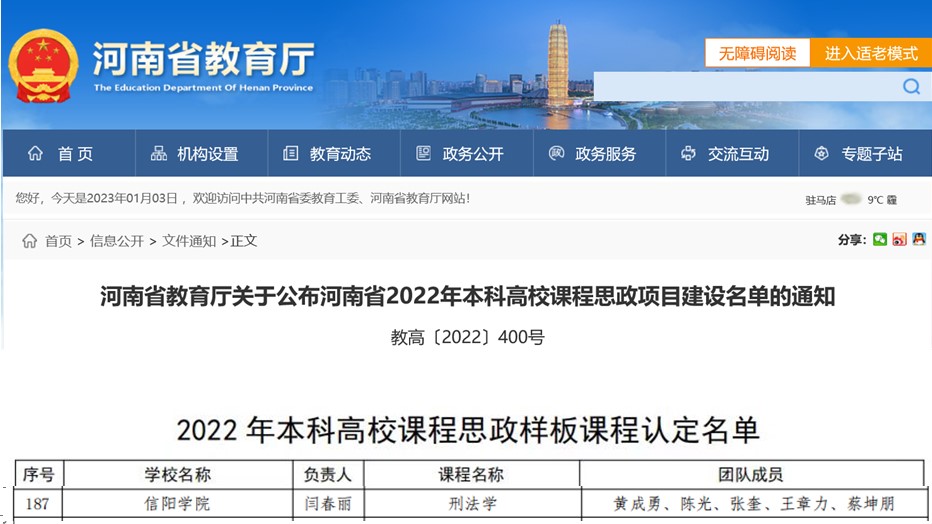 近日,河南省教育厅印发《关于公布河南省2022年本科高校课程思政项目建设名单的通知》(教高〔2022〕400号),我校社会科学学院闫春丽老师主持的《刑法学》课程获批为河南省2022年本科高校课程思政样板课程。这是我校课程思政建设工作取得的又一重要成果。