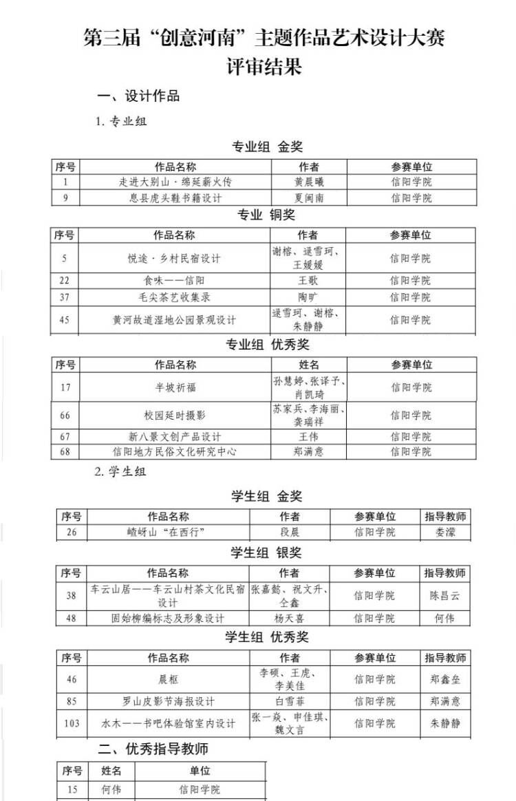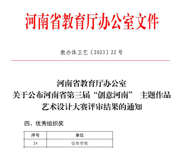 近日,河南省教育厅办公室公布了河南省第三届“创意河南”艺术设计大赛评审结果,信阳学院美术与设计学院师生获得奖项17项。其中,金奖3项、银奖2项、铜奖4项、优秀奖7项、优秀指导教师奖1项。同时,学校荣获“优秀组织奖”,在全省产生了重要影响。