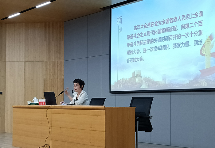 陈娱以党的二十大报告为解读蓝本,以中国式现代化发展建设为阐释主线,从“深刻把握党的二十大重要意义”“深刻把握过去5年的工作和新时代10年的伟大变革”“深刻把握谱写马克思主义中国化时代新篇章的历史责任”等七个维度,深入浅出地阐释了中国式现代化的本质特征、中国特色、发展前景、战略蓝图以及精神指引,勉励教师们要学深悟透、真抓实干,以优异的成绩确保党的二十大精神落地见效。整场学术报告主题鲜明、逻辑清晰、内容详实、言语生动。在场教师纷纷表示,对党的二十大报告精神有了更为深刻的认识。