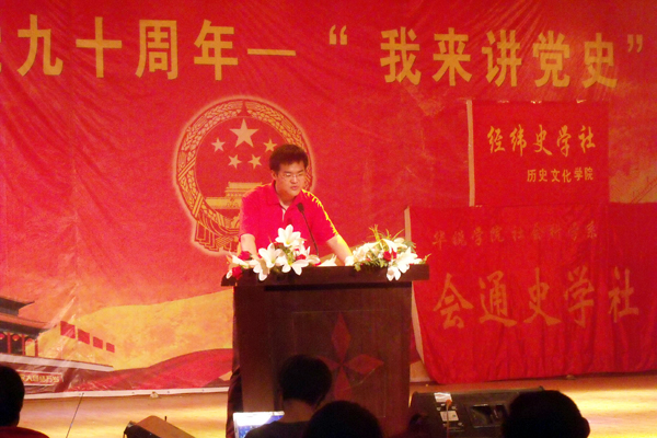 为庆祝中国共产党成立90周年,充分展现社科学子对党的真挚情怀,5月10日晚,由华锐学院社会科学系团总支、信阳师范学院历史文化学院团总支主办,会通史学社、经纬史学社承办的“我来讲党史”决赛在大学生活动中心成功举行。信阳师范学院历史文化学院叶宗宝博士、陈恭明、李志坚、教学秘书刘喜元、团总支书记周全明、社团指导老师沈海云、黄煌等老师,华锐学院团委秘书高昌慧、社会科学系党总支副书记秦笠、教学秘书余源鑫、学工秘书胡志国、团总支书记梁伟、蔡大海、代晓丽及社会科学系500余名同学到场观看了比赛。