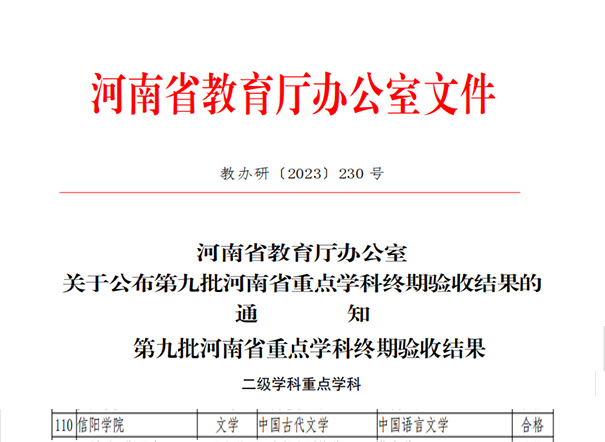 近日,河南省教育厅办公室印发《关于公布第九批河南省重点学科终期验收结果的通知》(教办研〔2023〕230号),我校第九批河南省重点学科中国古代文学顺利通过验收。