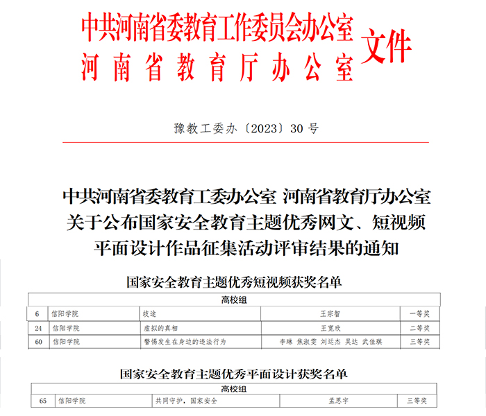 近日,河南省教育厅下发《中共河南省委教育工委办公室河南省教育厅办公室关于国家安全教育主题优秀网文、短视频、平面设计作品征集活动评审结果的公示》(豫教工委办〔2023〕30号),信阳学院推送的参赛作品获得多项荣誉。其中理工学院王宗智的作品荣获优秀短视频一等奖,土木工程学院王宽欣的作品荣获优秀短视频二等奖,音乐学院李琳、焦淑雯、刘运杰、吴达、武佳琪等联合推送的作品荣获优秀短视频三等奖,美术与设计学院孟思宇的作品荣获优秀平面设计作品三等奖。