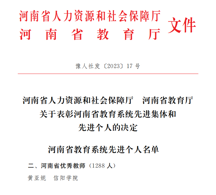 为进一步弘扬尊师重教社会风尚,充分发挥先进典型的示范引领作用,近日,河南省人力资源和社会保障厅、河南省教育厅公布了《关于表彰河南省教育系统先进集体和先进个人的决定》(豫人社发【2023】17号),我校文学院教师黄亚妮喜获“河南省优秀教师”称号。