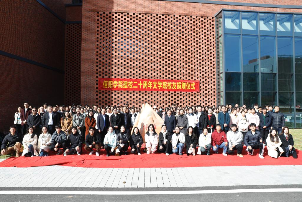 栉风沐雨二十载,坚守初心续华章。在信阳学院建校20年之际,学校文学院校友2013级李玲玲、2014级欧阳利妍、2015级杜志洋、杨柳、严瑞等向母校赠送一方镌刻着“博雅”的文化石,以感谢和铭记母校的培育之恩和恩师的教诲之情。11月16日上午,捐赠仪式在南湖校区文学院教学楼报告厅前举行。学校党委专职副书记施昌海出席捐赠仪式。校友办、宣传部、团委等部门负责人,文学院领导班子成员、校友代表、师生代表等参加了本次活动。文学院院长毛正天主持了捐赠仪式。