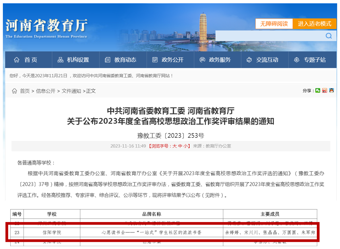 近日,中共河南省委教育工委河南省教育厅下发《关于公布2023年度全省高校思想政治工作奖评审结果的通知》(豫教工委〔2023〕253号),经高校推荐、专家评审、综合评议、公示等环节,我校余婷婷、宋川川、张晶晶、万圆圆等申报的《心愿读书会——“一站式”学生社区中的浓浓书香》荣获2023年度全省高校思想政治工作优秀品牌,在我校20周年华诞之际,为学校又增添了一项重要荣誉。