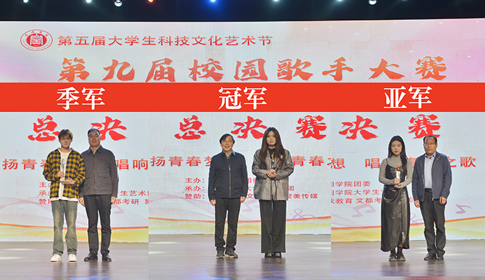经过激烈角逐,音乐学院宋佳乐同学凭借自己优雅的台风和动听的歌喉获得冠军,外国语学院靳子怡和杜雨恒同学分别获得亚军和季军。教育学院周巾翔,数学与统计学院邢钗钗,音乐学院陶思宜、赵冰冰,外国语学院万若兰,教育学院杨欣雨,理工学院赵晨晨荣获“十佳歌手”荣誉称号;音乐学院柴欣欣、王香香,商学院李梦真、仲丛天,理工学院莫翔等荣获“优秀歌手”荣誉称号。