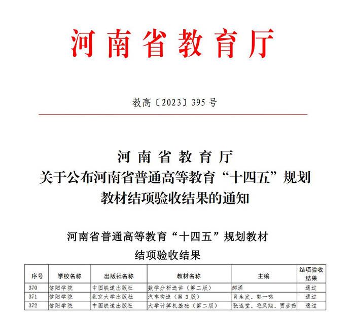 近日,河南省教育厅下发《关于公布河南省普通高等教育“十四五”规划教材结项验收结果的通知》(教高〔2023〕395号),我校郝涌主编的《数学分析选讲(第二版)》,肖生发、郭一鸣主编的《汽车构造(第3版)》,张连堂、毛凤翔、贾彦茹主编的《大学计算机基础(第二版)》等3部教材通过结项验收,被正式确定为河南省普通高等教育“十四五”规划教材。这是我校在高质量教材建设方面取得的重要成果。