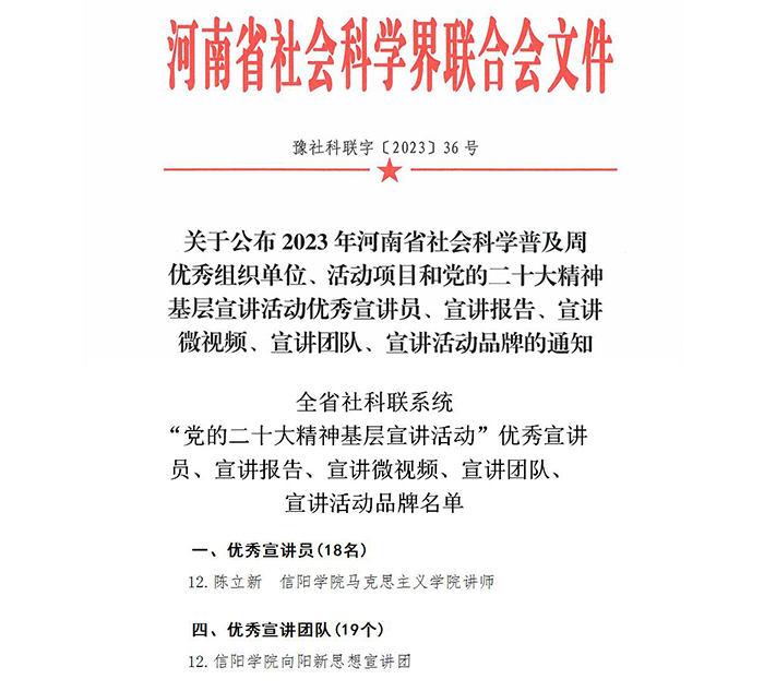 近日,河南省社会科学界联合会下发《关于公布2023年河南省社会科学普及周优秀组织单位、活动项目和党的二十大精神基层宣讲活动优秀宣讲员、宣讲报告、宣讲微视频、宣讲团队、宣讲活动品牌的通知》(豫社科联字〔2023〕36号),我校马克思主义学院教师陈立新获评“优秀宣讲员”,向阳新思想宣讲团获评“优秀宣讲团队”。
