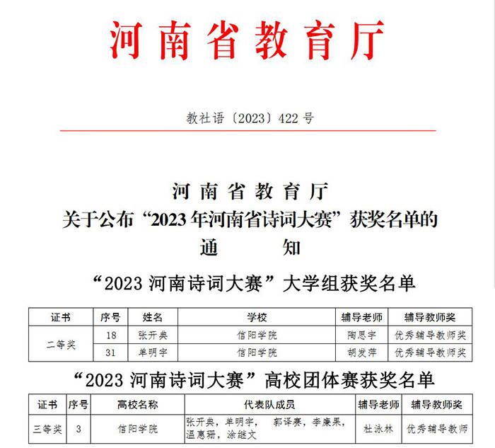 近日,河南省教育厅举办“2023年河南省诗词大赛”。我校由文学院刘之杰教授带队,杜泳林、胡发萍、袁文举、林月任指导教师,张开典、单明宇、郭译赛等六位同学参赛,经过激烈比拼,获得个人赛大学组二等奖、高校团体赛三等奖的好成绩。