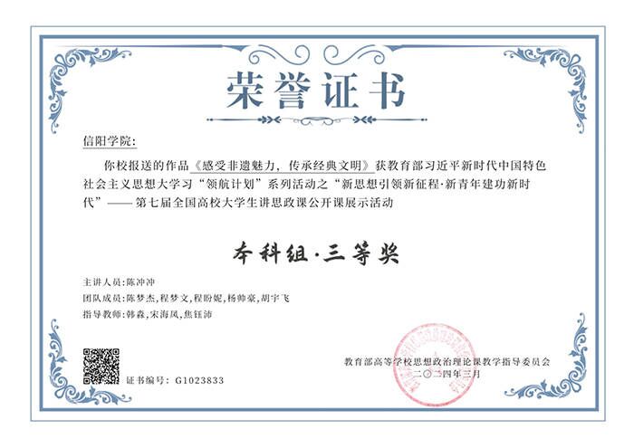 近日,教育部公布了第七届全国高校大学生讲思政课公开课展示活动拟获奖名单,由我校马克思主义学院韩淼、宋海凤、焦钰沛教师指导,由陈冲冲、陈梦杰、程梦文、程盼妮、杨帅豪、胡宇飞组成的学生团队申报的《感受非遗魅力,传承经典文明》荣获本科组三等奖。