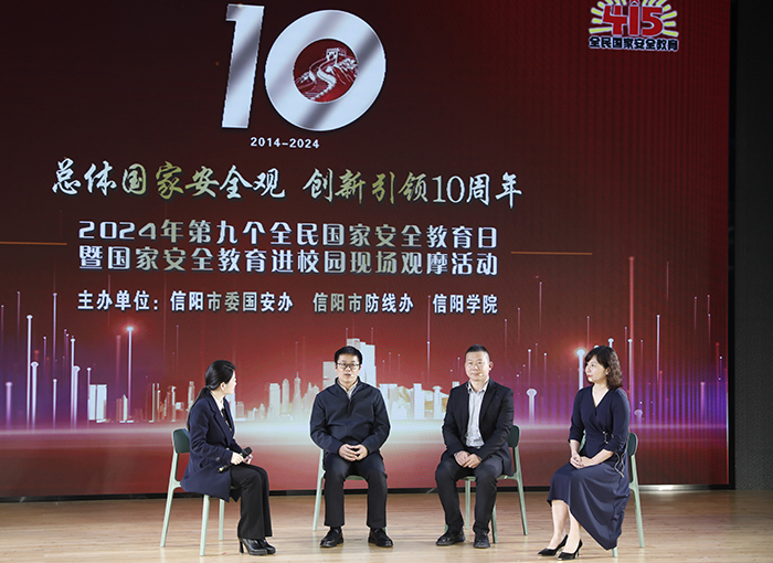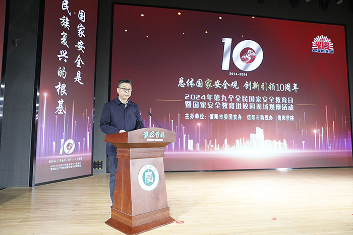 在第九个全民国家安全教育日来临之际,为深入贯彻落实习近平总书记总体国家安全观以及关于全面加强国家安全教育的重要指示精神,推动国家安全教育工作广泛深入普及,4月12日上午,由信阳市委国安办、市防线办主办,浉河区委国安办、信阳学院、浉河区防线办承办的国家安全进校园现场观摩活动在我校南湖校区教学楼113演播厅隆重举行。信阳市委副秘书长陈剑章,市委宣传部二级调研员张继峰,市国家安全局副局长谢军,市委机要保密局四级调研员刘顺飞,信阳学院副校长王志华,校长助理杨高伟,浉河区委国安办主任、区委国安委成员单位有关负责同志,浉河区中小学有关校领导等出席了活动。信阳学院部分师生参加了活动。