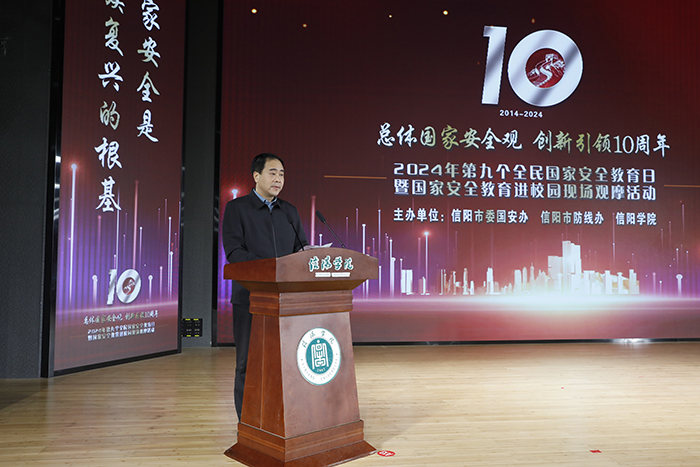 王志华代表信阳学院向莅临本次活动的各位领导和各位嘉宾表示热烈欢迎和崇高敬意。他指出,开展全民国家安全教育日活动,是贯彻落实总体国家安全观的重要举措。学校将以开展此次活动为契机,深入贯彻落实习近平总书记提出的“总体国家安全观”,精心组织开展形式多样、内容丰富的国家安全教育活动,使广大师生充分认识总体国家安全观的丰富内涵和维护国家安全的重大意义,教育引导全体师生把关心国家安全、维护国家安全作为一种思想共识和行动自觉。