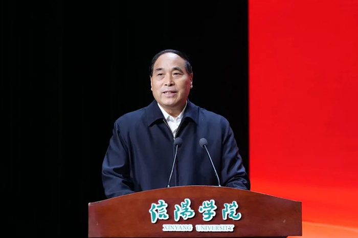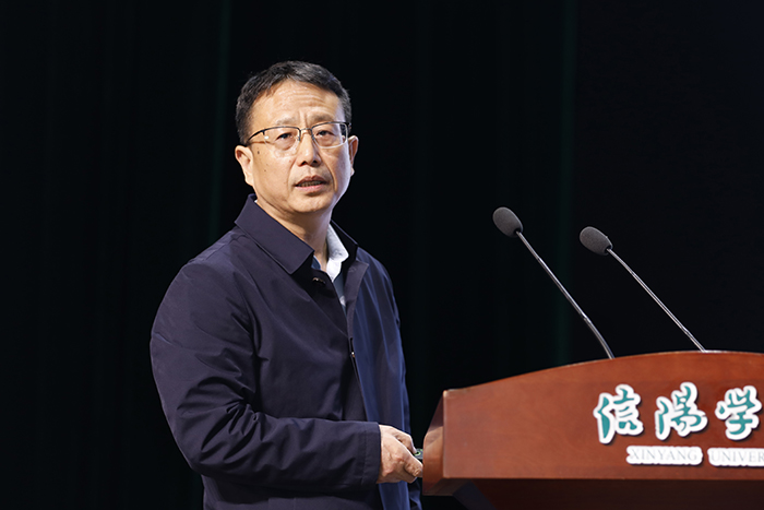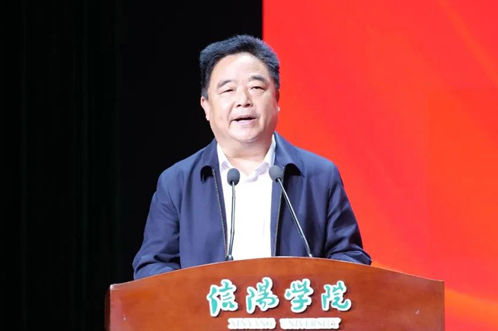 杨进对各位领导、专家、老师的到来表示诚挚的欢迎,对大家长期以来对信阳市的关心和支持表示衷心的感谢。他简要介绍了信阳市的基本情况并指出,信阳市深入学习贯彻习近平总书记关于“讲好党的故事、革命的故事、根据地的故事、英雄和烈士的故事,加强革命传统教育、爱国主义教育、青少年思想道德教育”等重要要求,立足革命老区丰富的红色资源,在全市大中小学深入开展思政课教学技能“大练兵、大比武、大展示、大提升”活动,创新实施实践教育基地建设教学,有机融合思政小课堂和社会大课堂,积极推进大中小学思政课一体化建设。信阳学院是我省第一所扎根豫南革命老区的民办本科高校。自创办以来,在省委教育工委、省教育厅的坚强领导和关心支持下,信阳学院积极践行“为党育人、为国育才”使命担当,聚焦创建全国一流民办高校目标,坚持“扎根革命老区、传承红色基因、服务区域发展”的办学特色,全力抓好人才培养、科学研究、社会服务、文化传承创新等各项工作,累计培育近6万名优秀学子,其中1/3在大别山革命老区就业创业,为加快大别山革命老区振兴发展、助力中原更加出彩作出了积极贡献。特别是信阳学院植根红色沃土,挖掘红色资源,形成了“三课堂”立体联动式的特色思政课改革创新模式,为新时代思政课建设作出了有益探索。