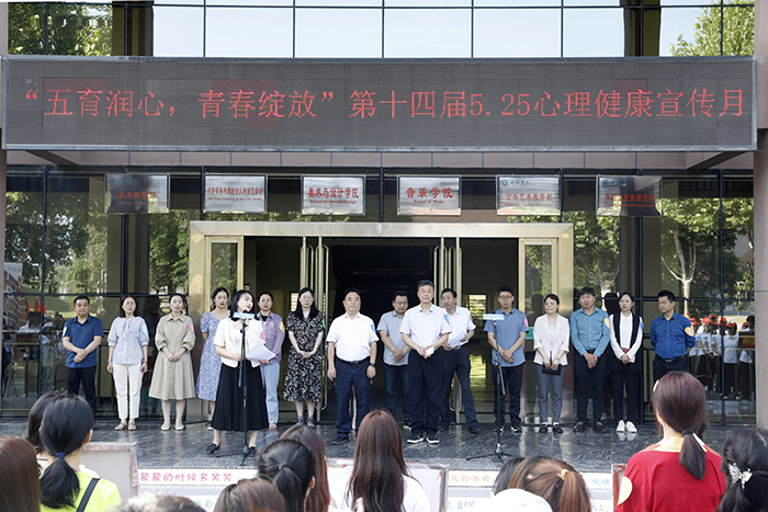 在师生热烈的掌声中,校党委书记褚金海宣布“五育润心,青春绽放”——第十四届“5·25”心理健康教育宣传月开幕!