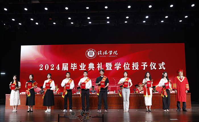 高雅宣读《关于表彰2024届优秀应届毕业生的决定》,仇佩霞等112名同学被评为“2024年河南省普通大中专学校优秀应届毕业生”,阮依柯等911名同学被评为“信阳学院2024年优秀应届毕业生”。