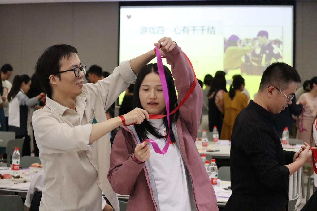 联谊趣味活动环节,青年教师们踊跃参与到“幸福传递”“心有千千结”“杯水传情”等轻松愉快的趣味互动游戏,大家相互配合、齐心协力,在温馨的氛围中增进了相互了解。现场洋溢着青春的热情与活力,掌声和欢呼声此起彼伏。