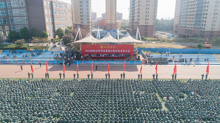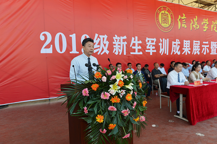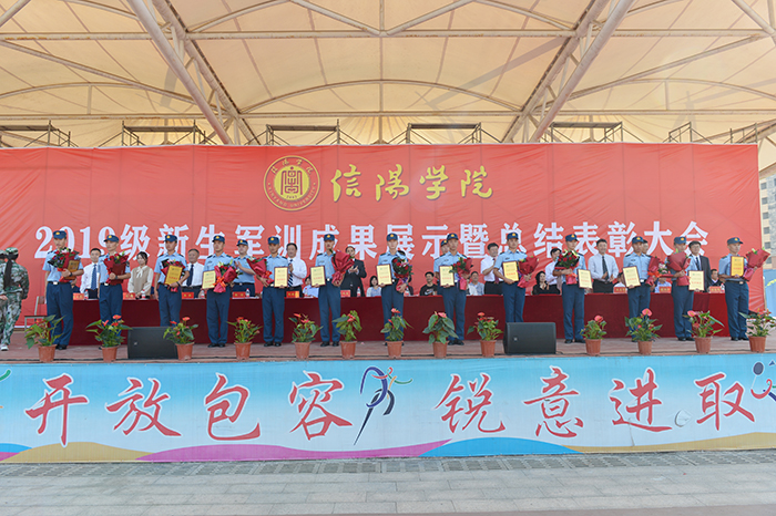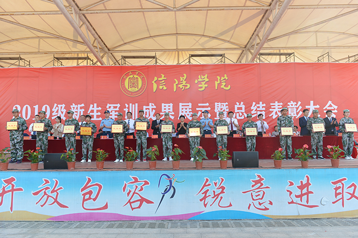 展飒爽英姿,扬青春风采。9月23日上午,学校2019级新生军训成果展示暨总结表彰大会在体育场隆重举行。空军工程大学航空机务士官学校学员二大队大队长孙豫龙上校、干事张涛中校,信阳学院理事长高云,名誉校长王北生,党委书记,战略发展咨询委员会主任熊健民,专职副书记施昌海,副校长王志华、王强,工会主席傅洪涛,校长助理高雅、杨高伟、张永志出席大会。承训教官,各学院院长、书记,各部门负责人,专家、教授、博士代表和2019级全体新生参加了大会。王志华主持了大会。