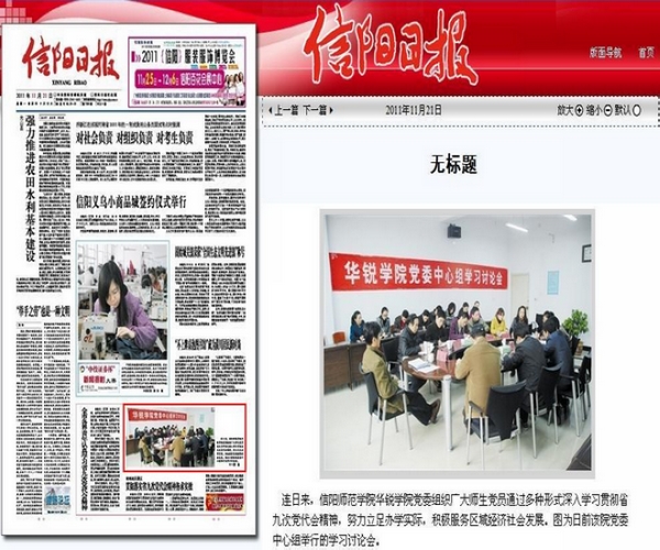 与此同时,11月21日,《信阳日报》头版刊发图片新闻,对我院师生开展学习贯彻省九次党代会精神活动,进行了报道。报道指出:连日来,信阳师范学院华锐学院党委组织广大师生党员通过多种形式深入学习贯彻省九次党代会精神,努力立足办学实际,积极服务区域经济社会发展。