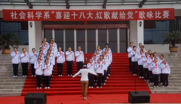 10月28日上午,“喜迎十八大,红歌献给党”歌咏比赛在教三楼广场举行,千余名师生参加了此次活动。参赛同学们着装整齐、精神焕发,他们满怀为党的十八大献礼的喜悦心声,站列成镰刀斧头的“党徽”和数字“十八”等队形,以嘹亮的歌喉演绎了《走进新时代》、《歌唱祖国》、《国家》等爱国歌曲,为即将召开的党的十八大献礼。据悉,信阳电视台将对该活动进行新闻报道。