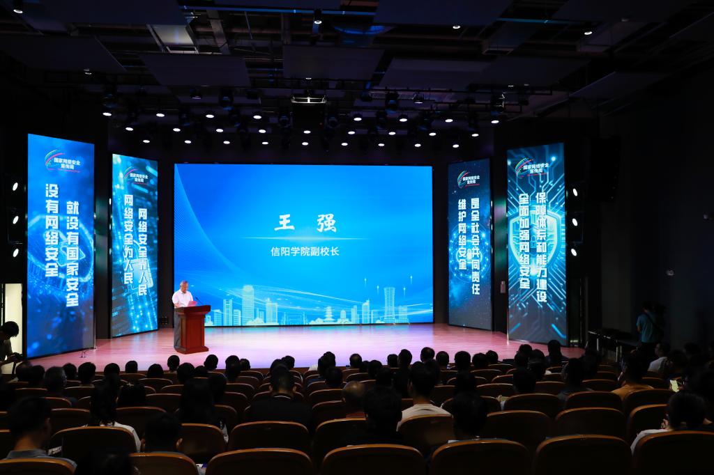 开幕式上,王强代表学校全体师生,向莅临活动的各位领导、嘉宾致以热烈欢迎与崇高敬意,向长期关心支持学校发展的信阳市各单位表示衷心感谢。他在致辞中简要回顾了我校的办学历程,介绍了学校近年来在科学研究、学科建设、硕士点建设等方面取得的突出成绩。王强强调,网络安全是国家安全的重要组成部分,也是高校落实立德树人根本任务的关键保障。学校始终紧跟新时代网络空间安全形势,坚持“教育、技术、管理”三管齐下,构建起“课堂教学+融媒平台+校园文化”三位一体的网络安全教育体系。他表示,高校作为人才培养主阵地,需在网络安全建设中发挥三重作用:培养具备安全素养的时代新人,为网络强国输送后备力量;发挥科研优势,破解网络安全技术难题;主动对接地方需求,成为普及网络安全知识的“宣传站”和服务社会的“桥头堡”。学校将以此次活动为契机,强化师生网络安全意识,倡导大家争做网络安全“守护者”、网络文明“传播者”、网络创新“践行者”,全面提升学校网络安全防护能力,为建设安全清朗的网络空间、实现网络强国目标贡献力量。