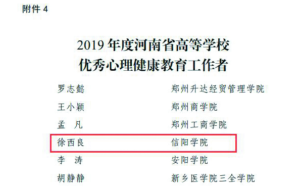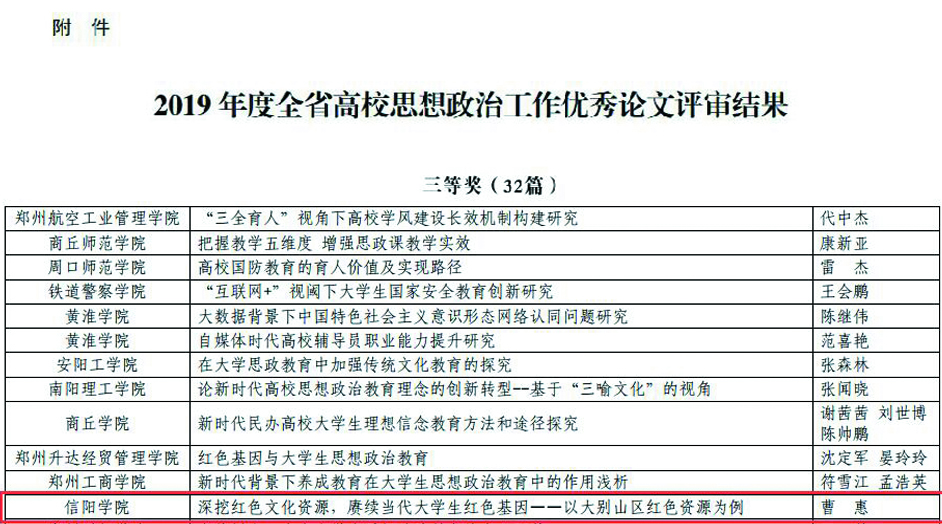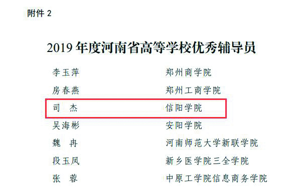 大数据与人工智能学院司杰被授予“2019年度河南省高等学校优秀辅导员”荣誉称号,教育学院徐西良被授予“2019年度河南省高等学校优秀心理健康教育工作者”荣誉称号,社会科学学院曹惠撰写的《深挖红色文化资源,赓续当代大学生红色基因——以大别山区红色资源为例》荣获2019年度河南省高校思想政治工作优秀论文三等奖。