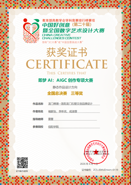 日前,2026年第20届中国好创意暨全国数字艺术设计大赛即梦AI:AIGC创作专项大赛圆满落幕。美术与设计学院学子凭借独具匠心的设计理念、扎实的视觉传达专业功底、出色的创新实践能力以及对AIGC技术的娴熟运用,荣获国赛三等奖。