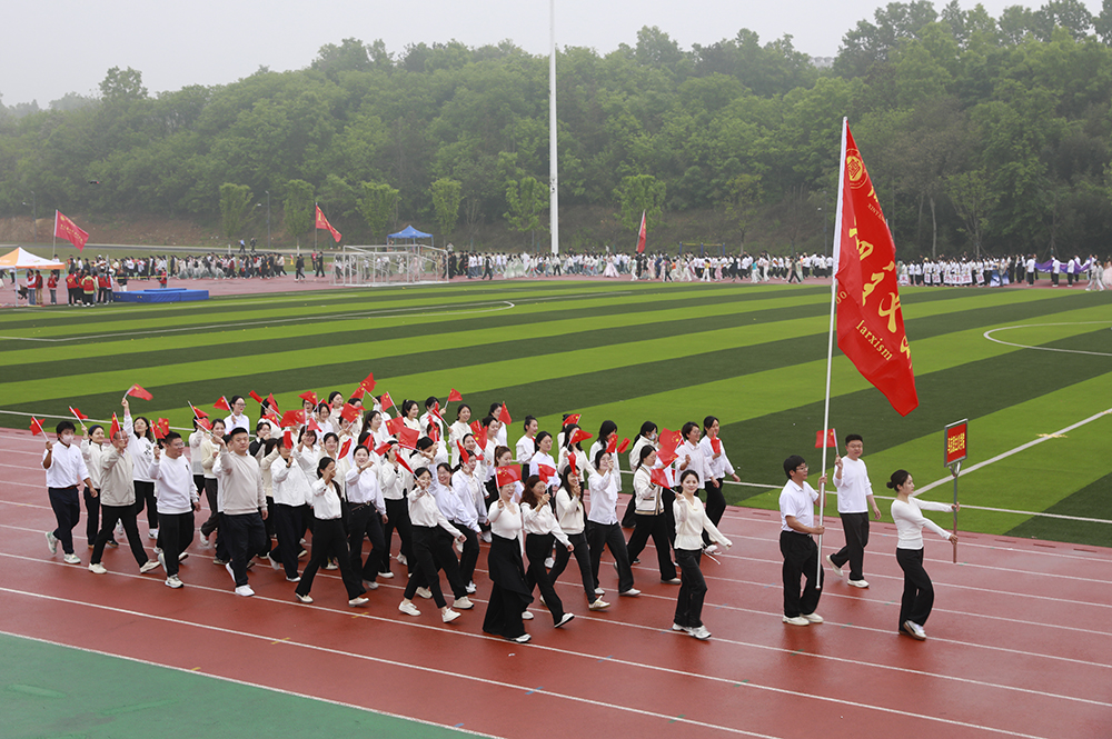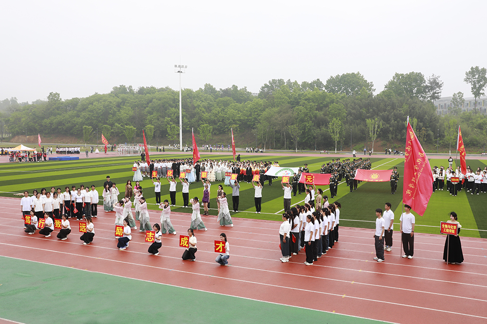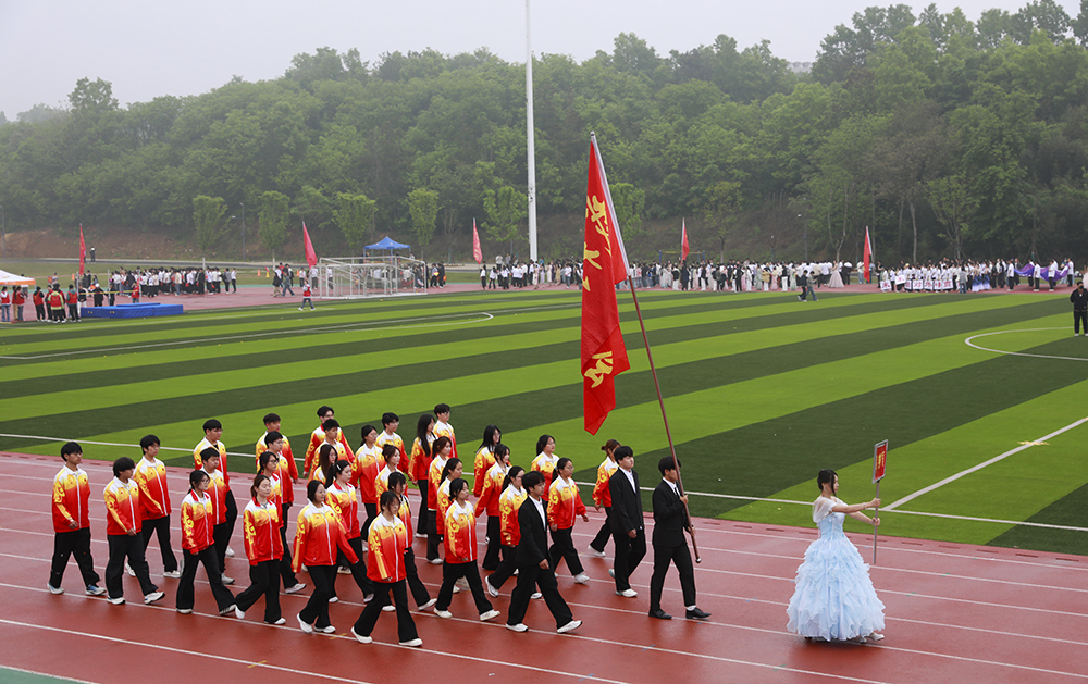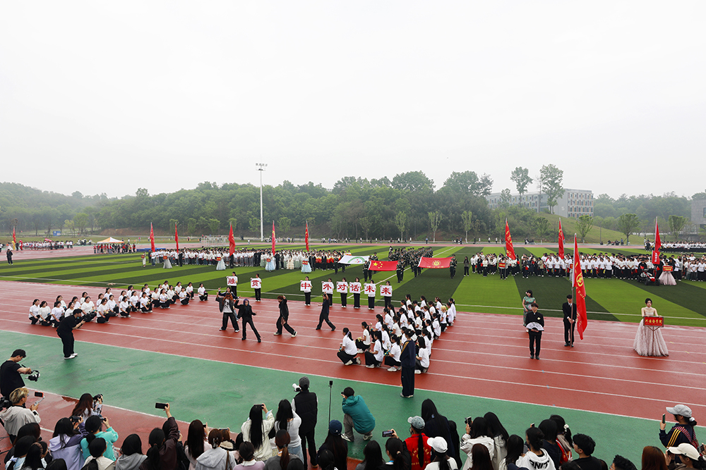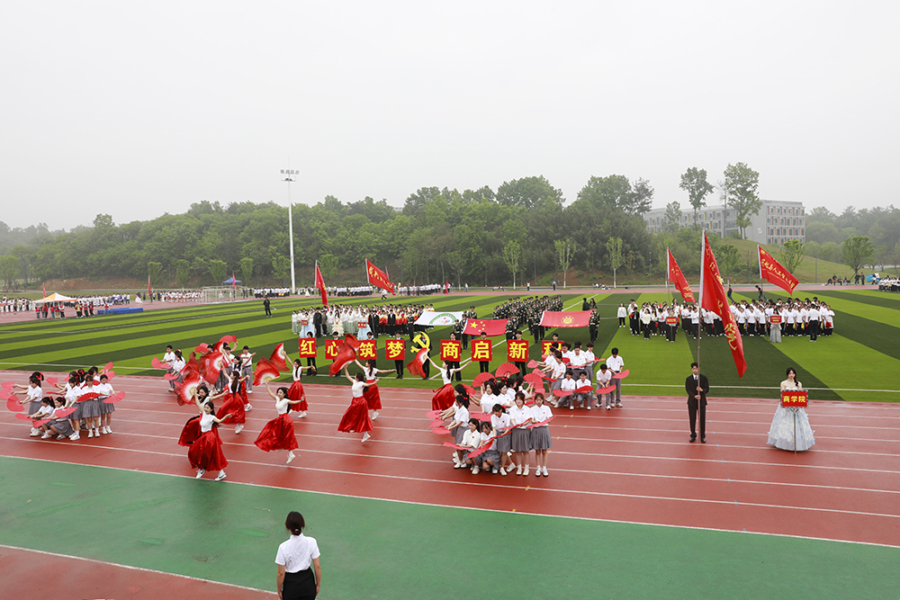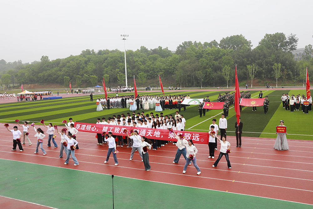 伴随着激昂的《运动员进行曲》,国旗、校旗、会旗、裁判员方队和马克思主义学院、文学院、计算机与人工智能学院、商学院、机电与汽车工程学院、物理与电子工程学院、生物与化学工程学院、美术与设计学院、社会科学学院、外国语学院、音乐学院、智能建造学院、数学与统计学院、教育学院等14个学院的运动员方阵迈着铿锵整齐的步伐,精神抖擞、意气风发地依次入场。各队伍表演构思新颖、独具特色,嘹亮口号、灵动队形与精彩展演充分展现学子昂扬风貌,赢得现场阵阵喝彩。