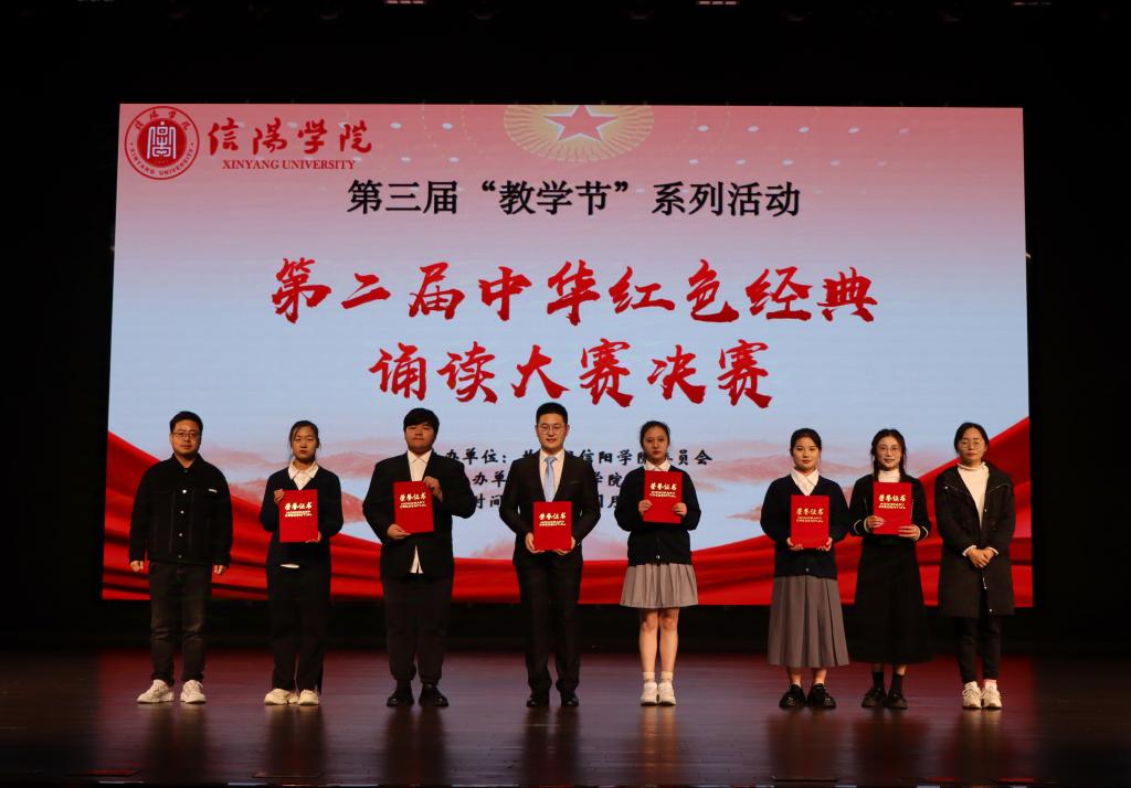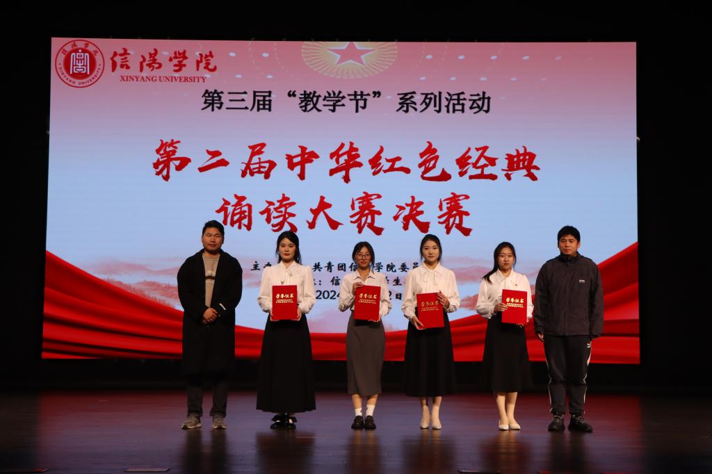 为深入学习宣传贯彻习近平新时代中国特色社会主义思想、习近平文化思想以及党的二十大、二十届三中全会精神,加强爱国主义教育,厚植爱国主义情怀,以诵读经典为载体,传递大学生对祖国的深情告白,11月22日,信阳学院第二届中华红色经典诵读大赛在音乐厅圆满落幕。本次大赛由校团委主办、学生会承办,主题为“诵读红色经典·激发奋进力量”。各学院团总支书记担任了本次比赛的评委,王施恩、谢龙龙主持了本次比赛。