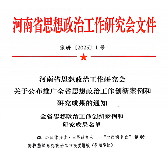 近日,河南省思想政治工作研究会发布《关于公布推广全省思想政治工作创新案例和研究成果的通知》(豫研〔2025〕1号),我校申报的《小团体共读·大思政育人——“心愿读书会”推动高校基层思想政治工作提质增效》项目获评全省思想政治工作创新案例。