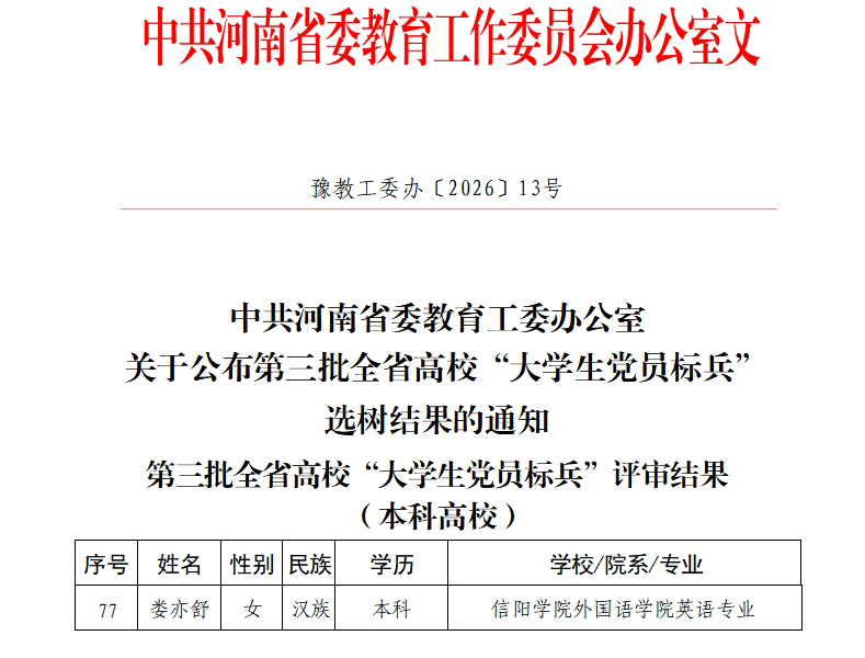 近日,中共河南省委教育工委公布了第三批全省高校“大学生党员标兵”评审结果,经学校遴选、推荐、专家评审,认定第三批全省高校“大学生党员标兵”100名,我校外国语学院2022级英语本科9班学生娄亦舒入选。